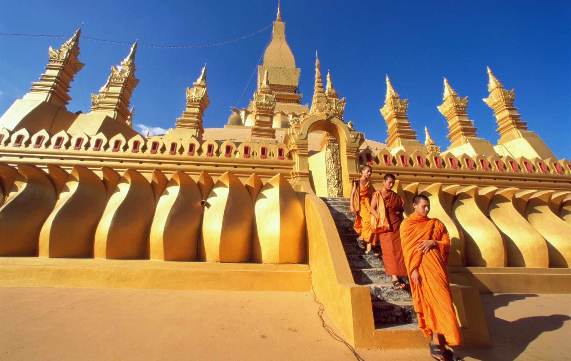 De morgenfriske kan opleve de orangeklædte munke gå i lange rækker gennem byens gader og samle donationer ind. Der findes 32 templer i Luang Prabang, så det er et imponerende syn, der møder én ved daggry. Man kan besøge nogle af byens vigtigste templer, nyde stemning og friskbagte croissanter fra fortovscafeen eller i ro og mag besøge Konge Paladset og få historien om Laos sidste konge. Tag en vandretur til templet på Phousy Hill, et lille bjerg midt i byen. Det er alle anstrengelserne værd, når udsigten over byen og de frodige bjergene åbenbarer sig. Om aftenen lukkes hovedgaden ned, og op springer madboder samt et utal af boder med tøj, souvenirs, kunsthåndværk og så videre